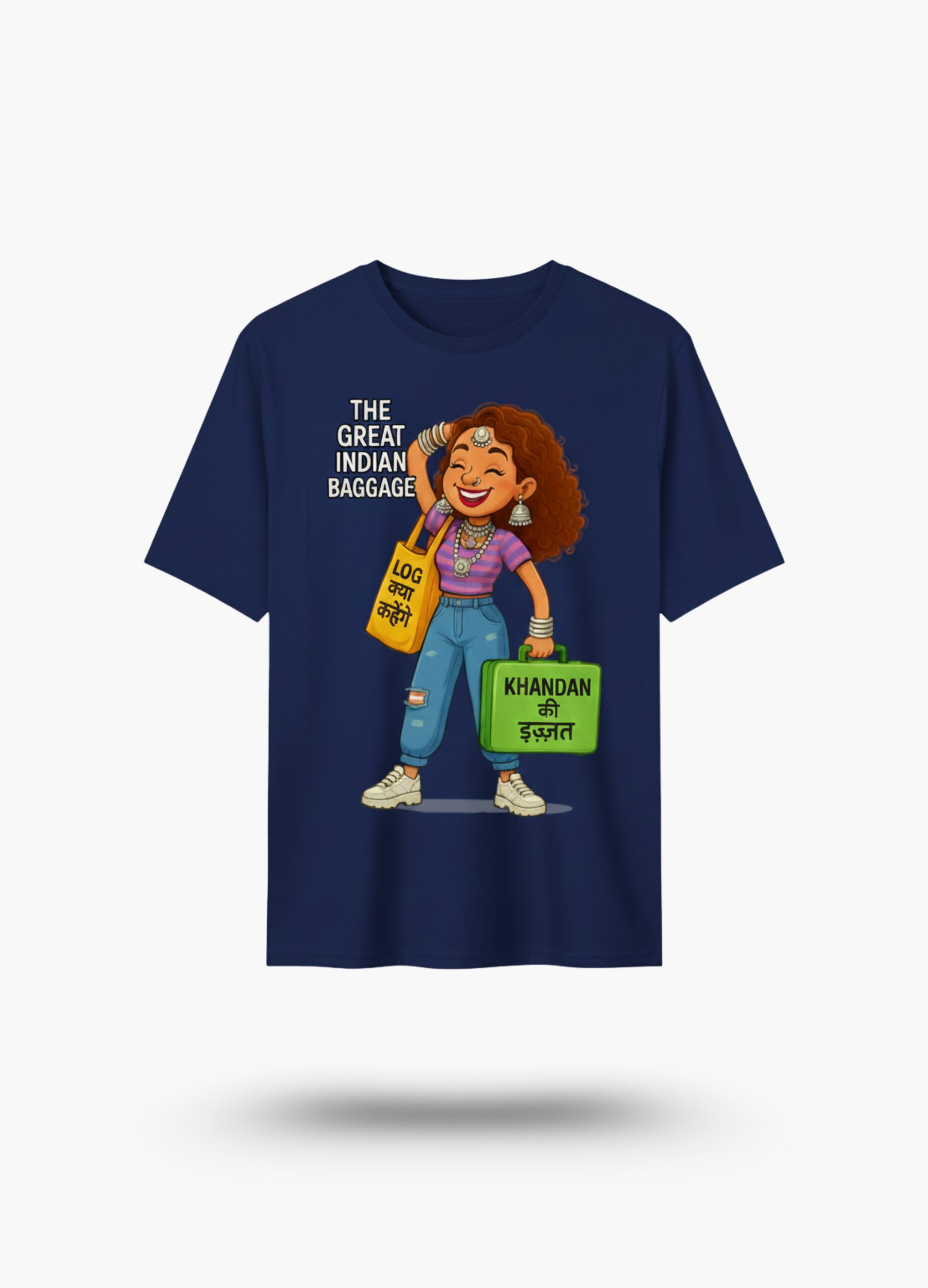 Inspired by the stories we carry every day, the Great Indian Baggage Graphic T-Shirt is a fun yet meaningful expression of modern Indian life. Designed with a bold graphic and crafted for comfort, this T-shirt is perfect for casual outings, travel days, or everyday wear.